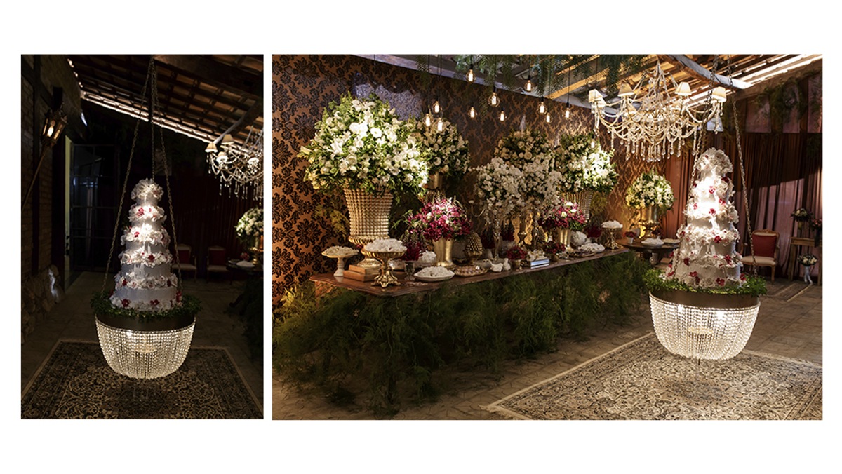 02 Hanging cake ou Bolo suspenso. Cada vez mais buscando propostas inovadoras para as festas, os decoradores pensaram em algo diferente e inusitado para ressaltar o bolo, (tendência que começou a ser usada em casamentos) e assim surgiu o Hanging Cake ou bolo de noiva suspenso.
